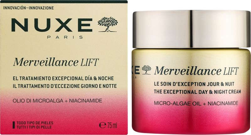 Серията NUXE Merveillance LIFT е създадена за стягане на кожата и коригиране на бръчките, като използва ултра-коригиращо масло от микро-водорасли, което концентрира силата на 4 милиарда активни клетки в една капка. Продуктите в серията включват стягащ серум, дневен крем с пудрен ефект, околоочен крем и нощен крем, които спомагат за укрепване на кожата, изглаждане на бръчките и възстановяване на младежкия вид. Формулите са с високо съдържание на съставки от естествен произход и предлагат приятни текстури с деликатен аромат, съчетаващ флорални и мускусни нотки.