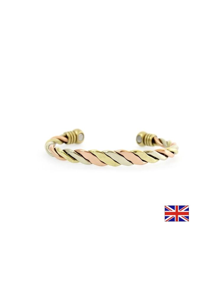 Стилен аксесоар, изработен от комбинация от три вида метални покрития – мед, цинк и месинг, допълнен с вградени магнити, предназначен за ежедневно носене с цел подпомагане на общото благосъстояние. Комбинацията от металите се свързва с поддържане на минералния баланс и жизнения тонус на организма, докато магнитите създават постоянно магнитно поле, което традиционно се използва за стимулиране на кръвообращението, намаляване на мускулното напрежение и подпомагане на комфорта в ставите. Носенето на такава гривна може да допринесе за усещане за повече енергия, баланс и релаксация в ежедневието, като същевременно представлява елегантен и удобен аксесоар. Гривната е с размер M – около 19 см, предназначена за средна китка, и се препоръчва да се носи директно върху кожата през по-голямата част от деня.