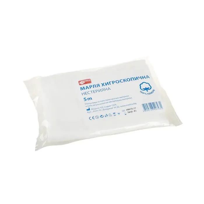 Хидрофилна памучна марля, предназначена за почистване, покриване и защита на рани, както и за изработване на компреси, превръзки и тампони при оказване на първа помощ или при медицински процедури. Марлята е изработена от качествен памук с добра абсорбираща способност, което позволява ефективно поемане на течности и раневи секрети и подпомага поддържането на добра хигиена на раната. Материята е мека, дишаща и щадяща кожата, което я прави подходяща за използване върху чувствителни участъци и при различни медицински манипулации. Основното действие на продукта е да предпазва раната от замърсяване и механично дразнене и да подпомага процеса на превързване и обработка на рани. Начин на употреба: марлята се използва за почистване или покриване на предварително обработена рана, като при необходимост се фиксира с бинт или лейкопласт.
